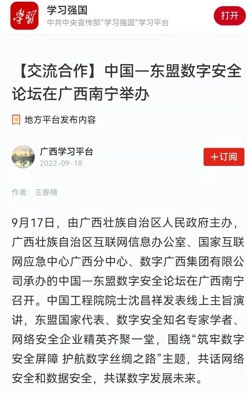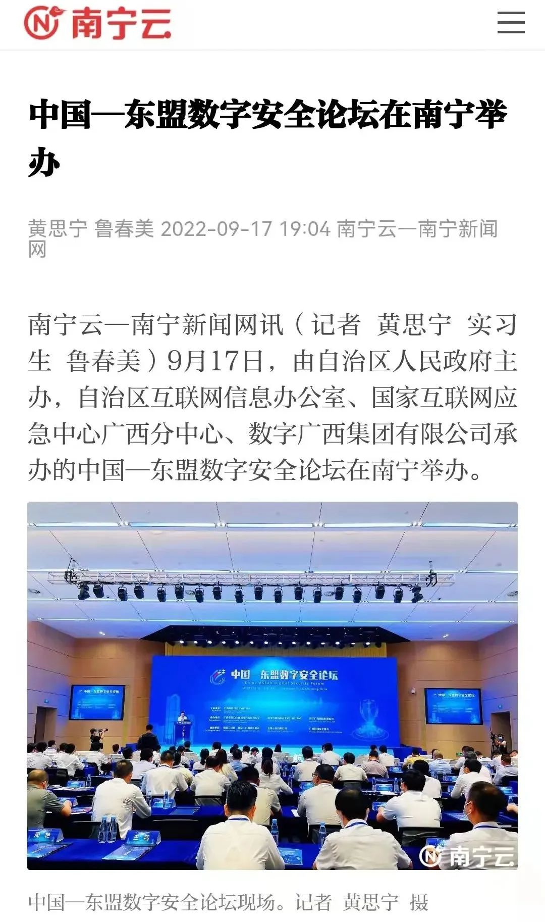 2022年9月17日,中国—东盟数字安全论坛召开,此次论坛主题鲜明,聚焦网络安全和数据安全,共同探讨网络安全领域的法律、技术和产品发展的新形势、新动态,致力于提升数字安全防护能力,深化广西与东盟各国在数字经济交流合作,推动数字广西和中国—东盟信息港建设,实现互联互通的“数字丝绸之路”,打造互利共赢的“利益共同体”和共同发展繁荣的“命运共同体”,搭建生态合作、互利共赢的交流平台。央视新闻、中新网、学习强国、广西新闻网、广西广播电视台、南宁新闻网等多家媒体进行了报道。